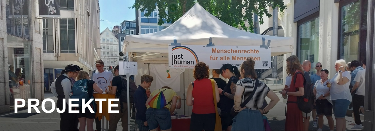 just human unterstützt Menschen, die von Krieg, Gewalt, politischer oder persönlicher Verfolgung, Ausbeutung, strukturellen Fluchtursachen oder wirtschaftlicher Not betroffen sind. Die Unterstützung ist in allen Phasen von Verfolgung oder Flucht möglich: am Heimatort, während der Flucht oder am Zufluchtsort. Sie soll dazu beitragen, ein Leben in Sicherheit und Selbstbestimmung zu ermöglichen.